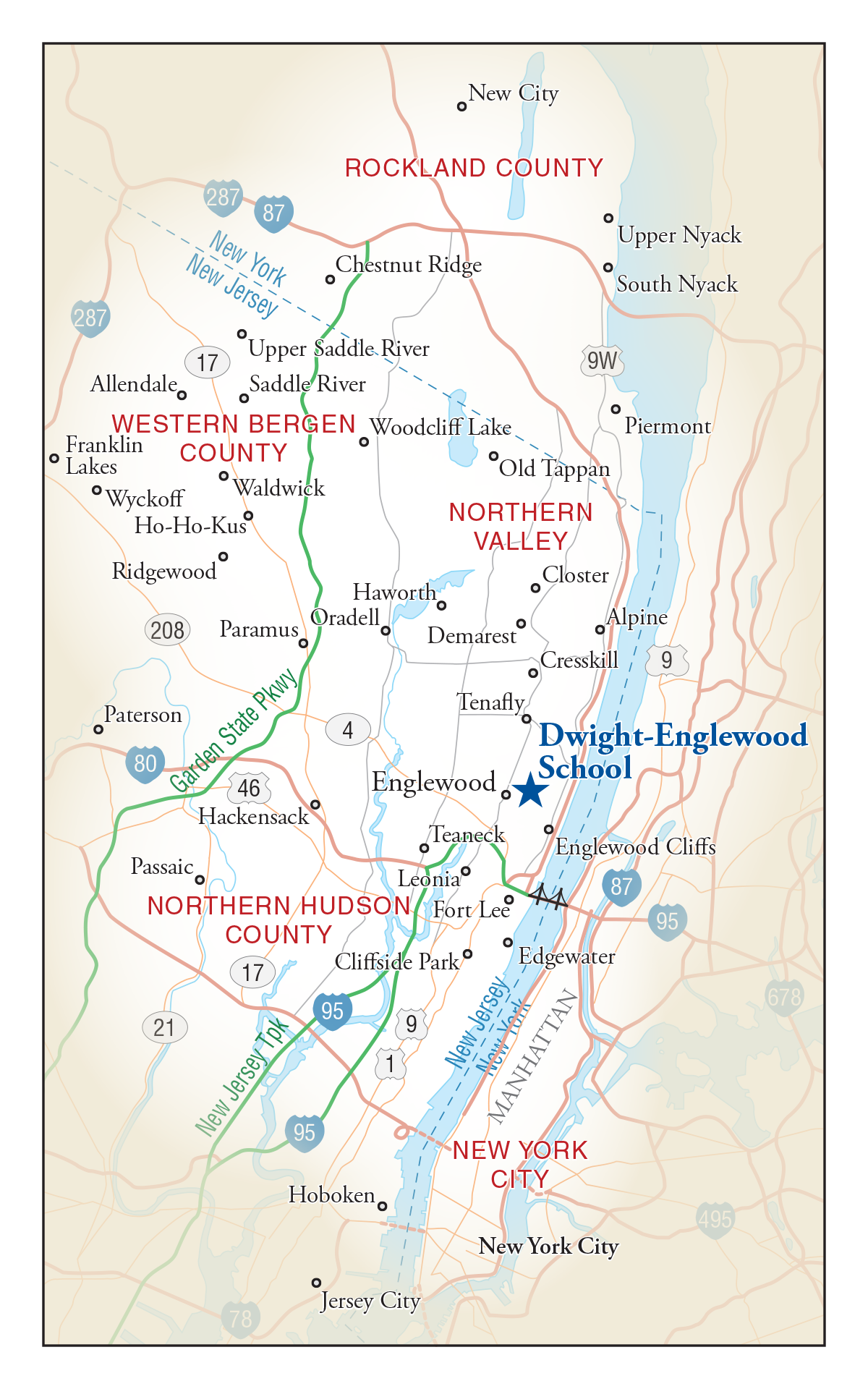 Dwight-Englewood is conveniently located within minutes of the George Washington Bridge and all major highways in the New Jersey and New York metro area.